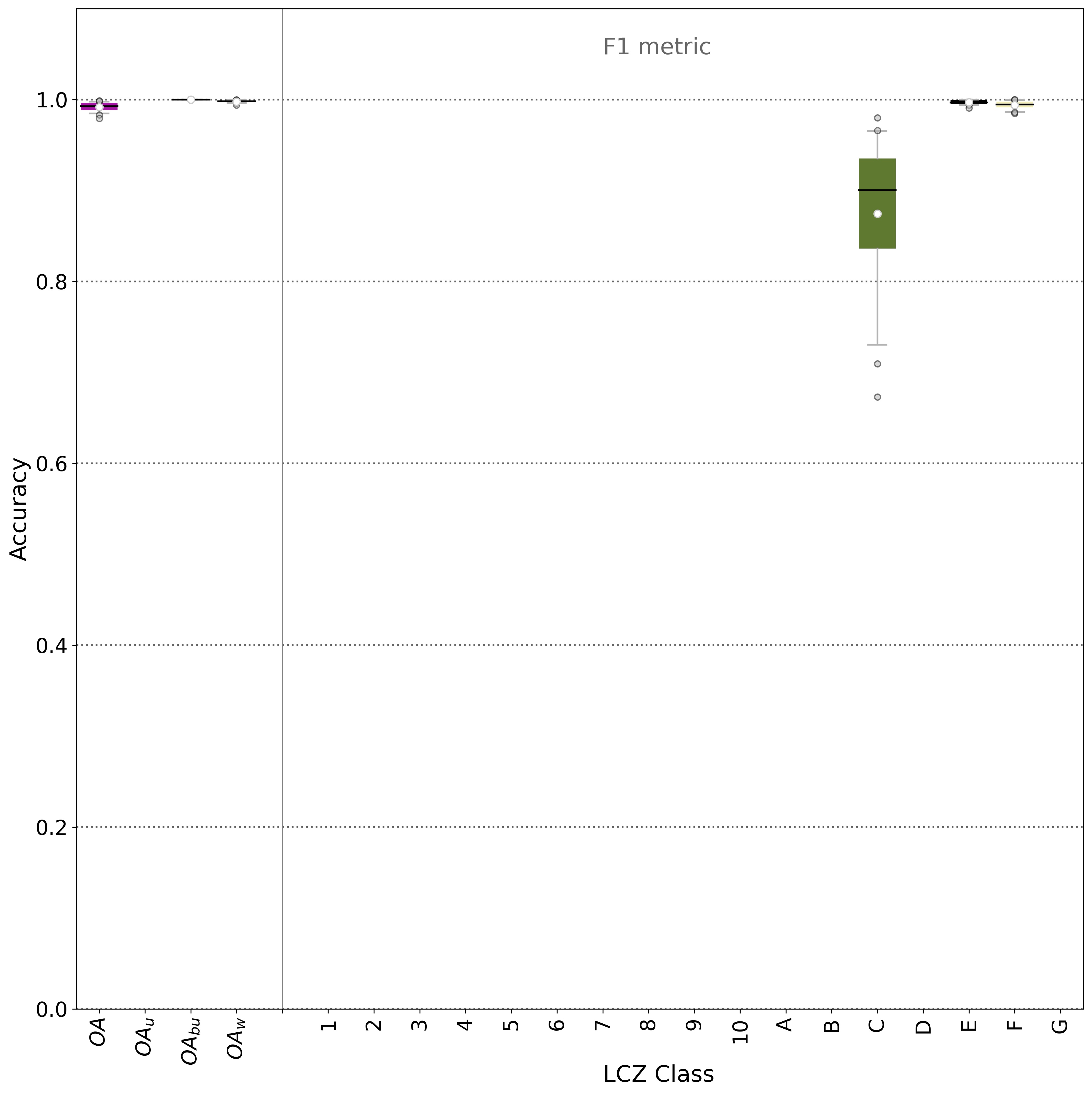The final filtered LCZ map is produced using all training areas and input features. Corresponding overall accuracies are: