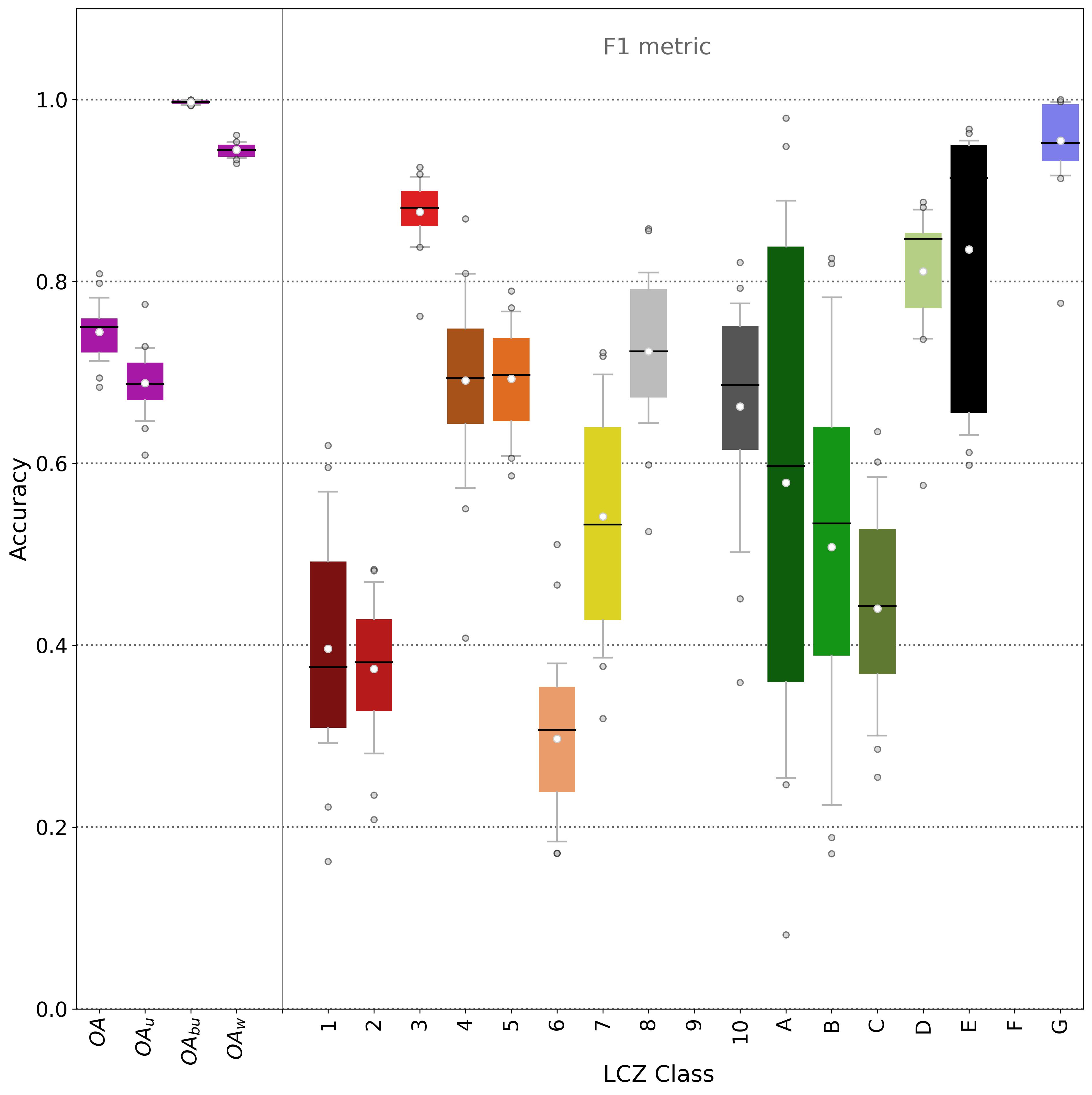 The final filtered LCZ map is produced using all training areas and input features. Corresponding overall accuracies are: