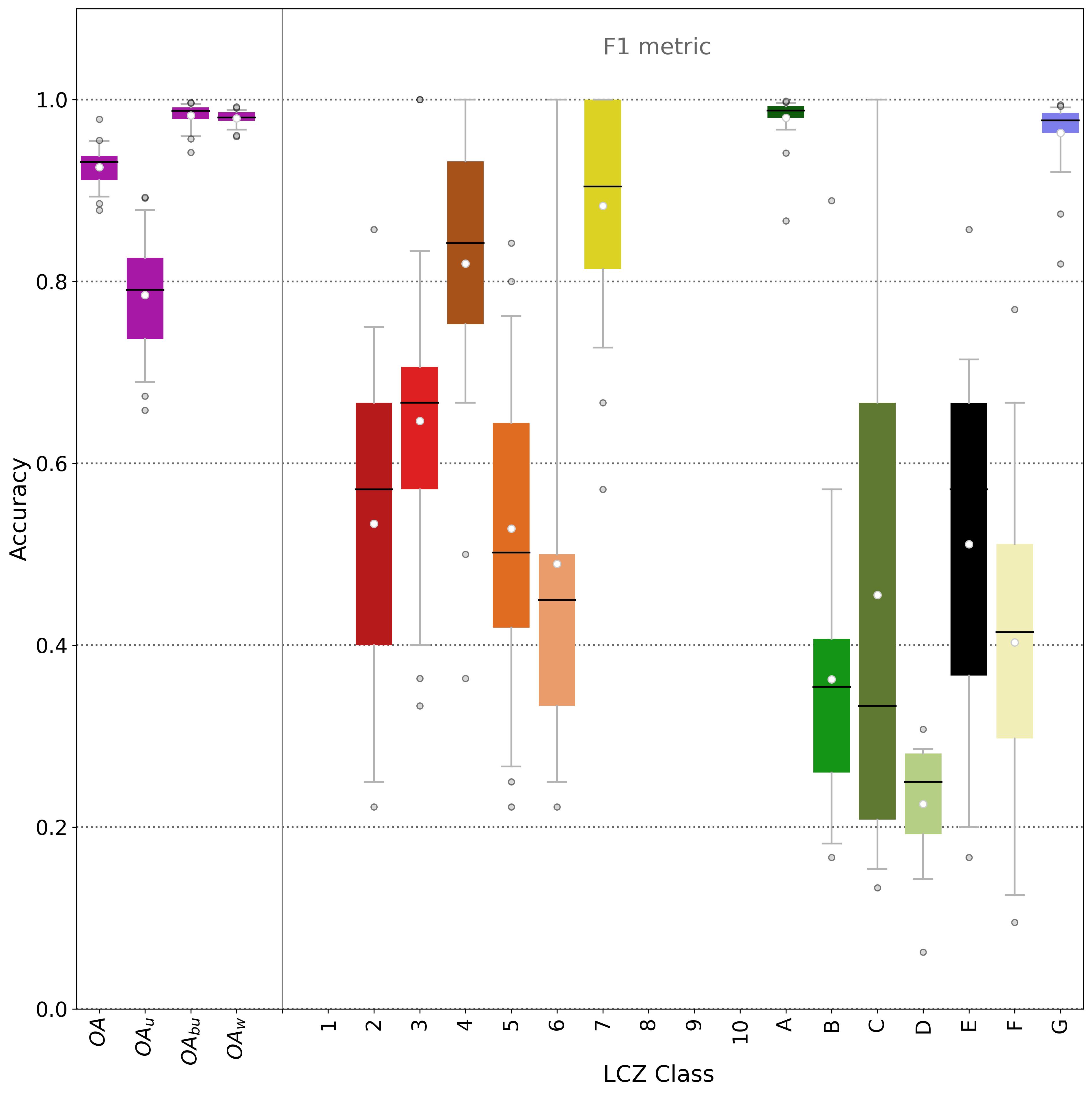 The final filtered LCZ map is produced using all training areas and input features. Corresponding overall accuracies are: