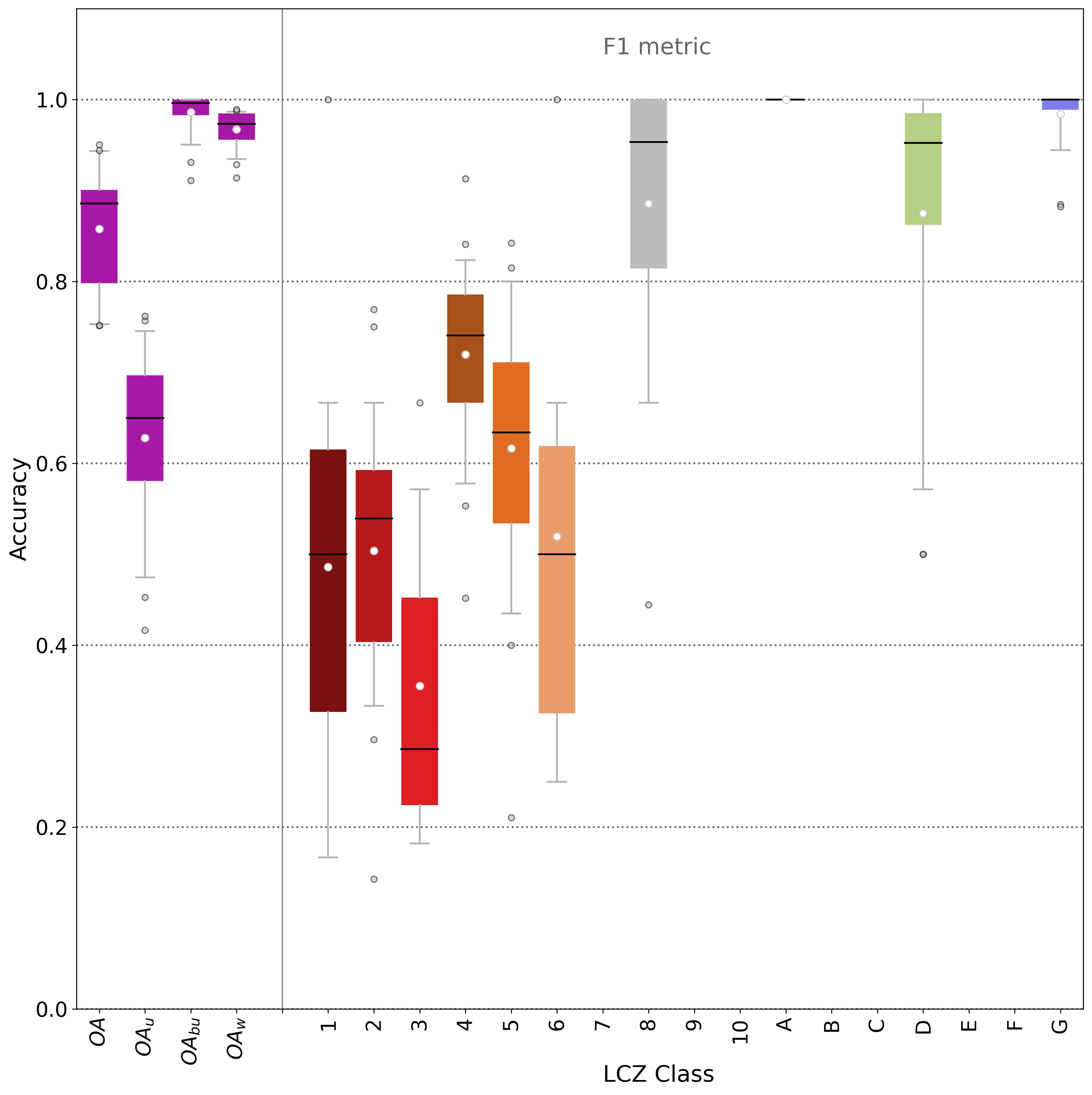 The final filtered LCZ map is produced using all training areas and input features. Corresponding overall accuracies are: