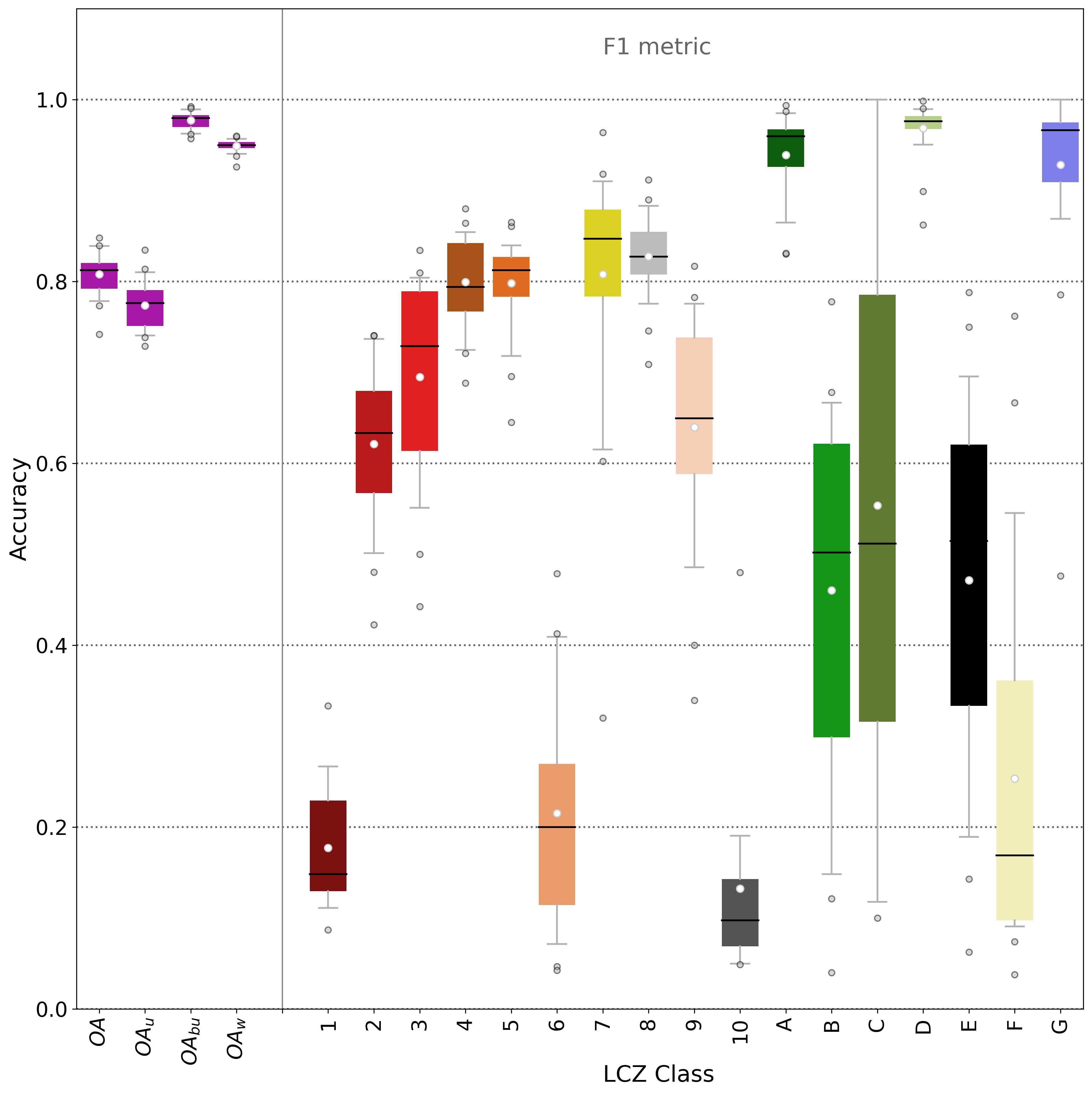 The final filtered LCZ map is produced using all training areas and input features. Corresponding overall accuracies are:
